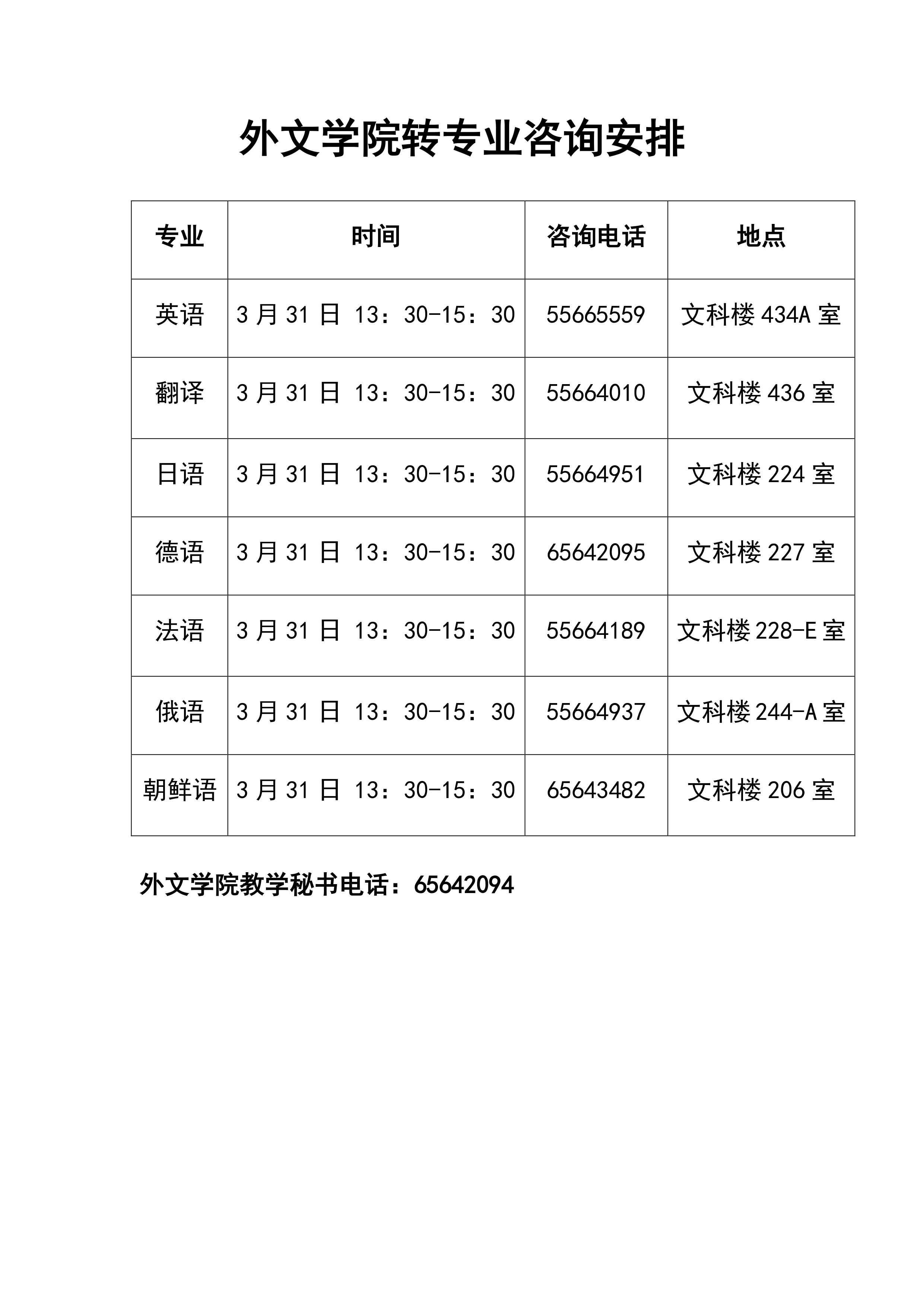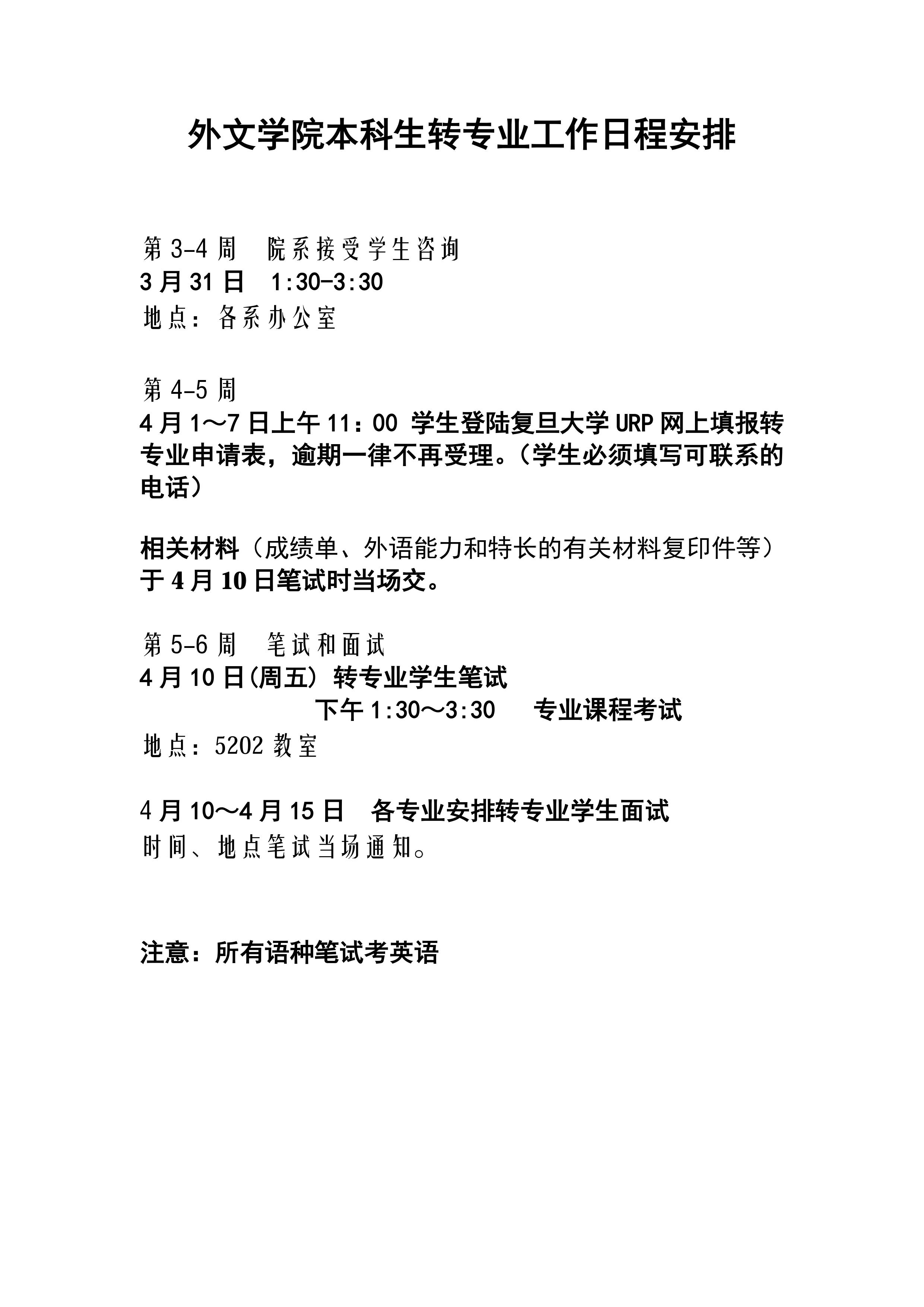外文学院2015年本科生转专业工作日程安排