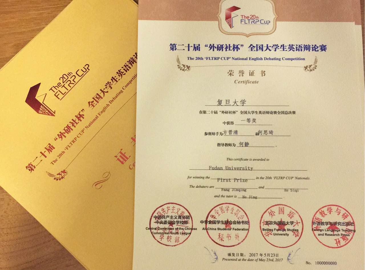 英语系2013级本科方晋清与英语系2016级本科何思琦同学(指导教师何静)代表leyu乐鱼·官方web站登录入口在全国决赛中获得一等奖,何思琦获最佳辩手称号。