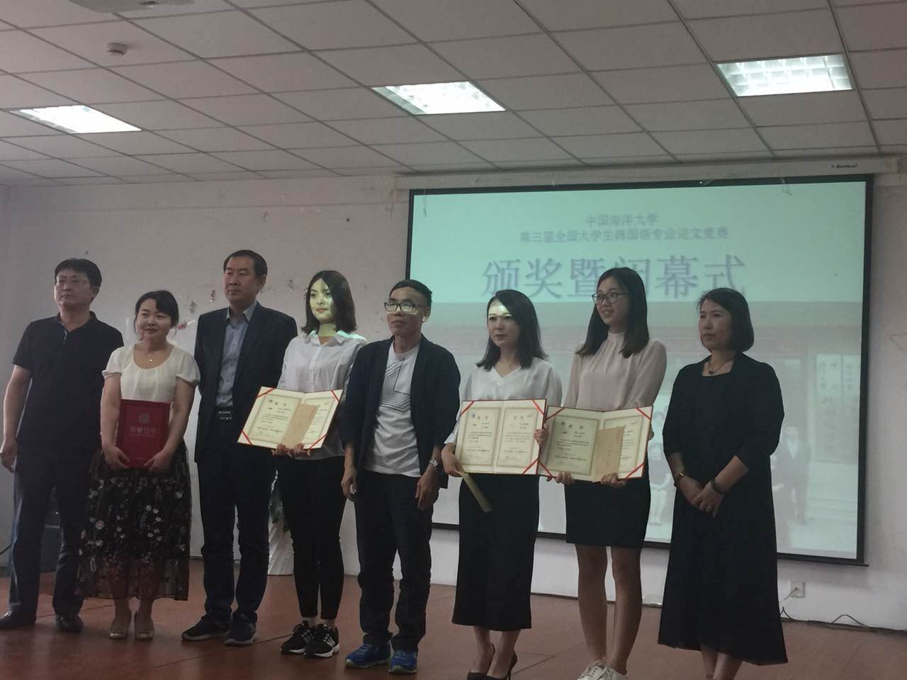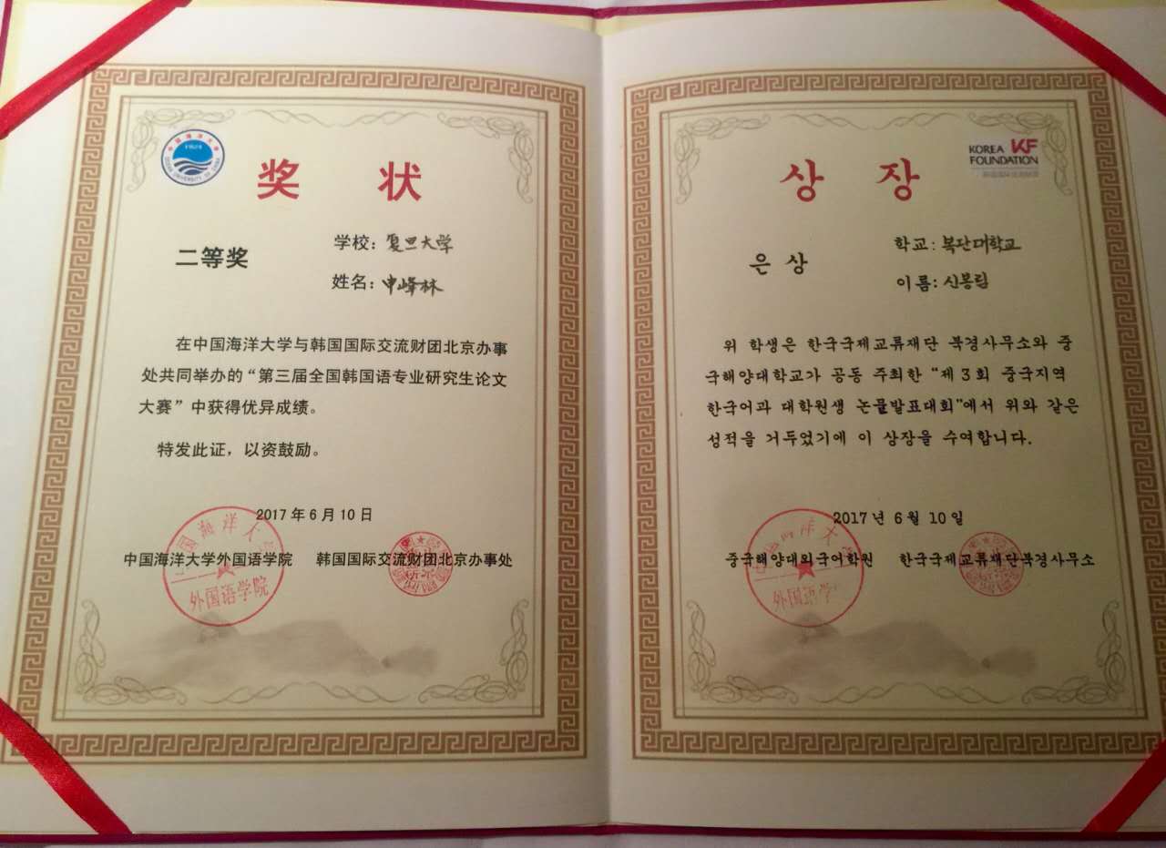 6月10日,在中国海洋大学进行的第三届全国韩国语专业研究生论文大赛中,我校外文学院韩文系硕士研究生申峰林同学(黄贤玉教授指导)荣获二等奖。此次大赛由中国海洋大学与韩国国际交流财团北京办事处共同主办,来自北京大学、山东大学、吉林大学、上海外国语大学、延边大学等全国20所大学的20名研究生代表携论文参加了比赛。