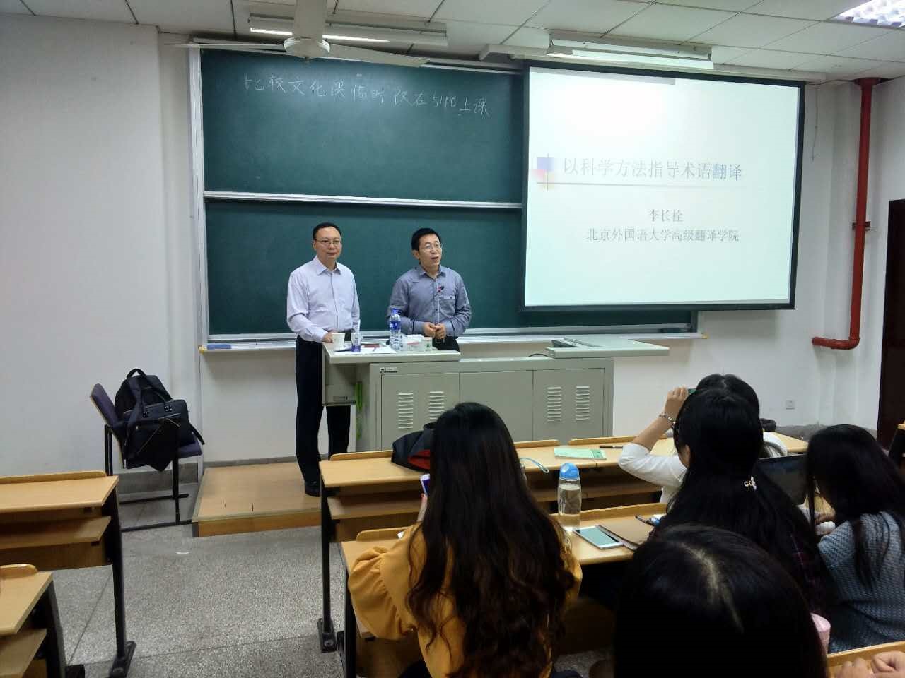 2017年10月11日上午,由leyu乐鱼·官方web站登录入口外文学院主办的系列讲座之第二场在第五教学楼正式开讲啦!现场气氛热烈,座无虚席,许多对翻译研究感兴趣的小伙伴们都早早慕名前来,以期感受北外高翻名师李长栓老师的风采。李老师继昨晚所作的题为“翻译是发现和再现真相的过程”的讲演后,又紧接着奉献了一场紧扣“以科学方法指导术语翻译”为主题的演说。本场讲座由王炎强老师担任主持。