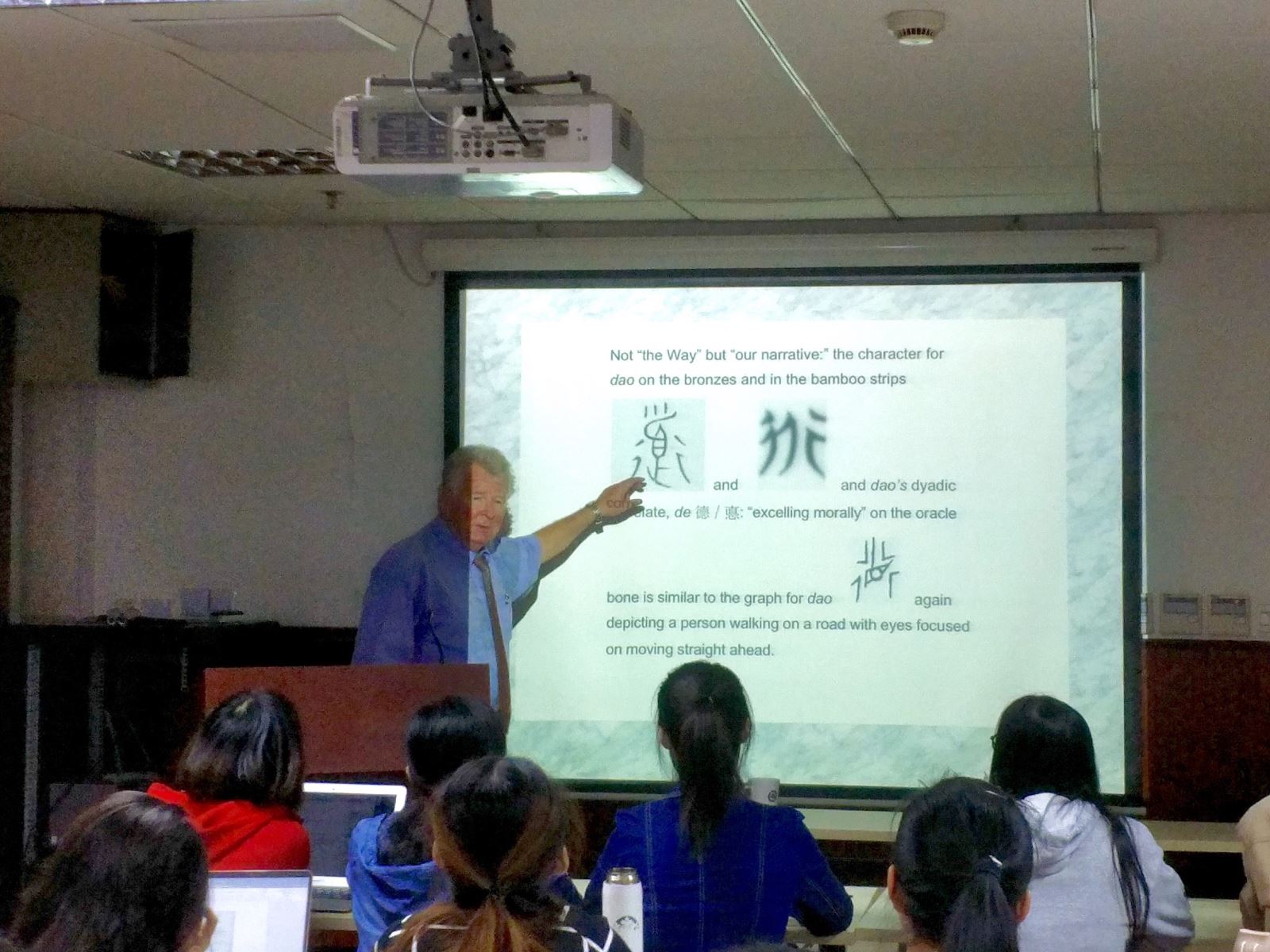 随后,安乐哲教授又指出了中西方哲学文化方面的差异对中国哲学英译造成的影响。他谈道,欧洲传教士在翻译中国传统文化中的“天”、“义”、“仁”、“礼”、“孝”等概念时,大多采用了与西方宗教中相对应的词汇,如“heaven”、“righteousness”、“benevolence”、“ritual”、“filial piety”,但这些英译词汇在一定程度上曲解了中国传统文化。如“righteousness”一词在英语中指按照上帝的意旨行动,含有一定的宗教色彩,但汉语中的“义”并无宗教意蕴,如此翻译很容易对外国人造成误导。随后他又列举了中国传统哲学里的“善”的概念。在甲骨文里,“善”字含有“言”字旁,即表示“善”是在与他人的社会交往中不断发展形成的,而英语中的“good”却未蕴含这种发展的过程。正是这种文化的不对称性造成了翻译时的困难。他引用了犹太哲学家维根斯坦的名言:“语言的界限就是世界的界限。”因此,他针对跨文化翻译中存在的问题,提出了自己的建议与方法,即译者必须重视文化层面上的翻译,不可拘泥于逐字逐句的翻译。当两种文化间的不对称性无法通过翻译得到解决时,不如直接将原语中的概念放入外文译本中,再辅以注释,无需翻译而将理解的任务直接抛给读者。
