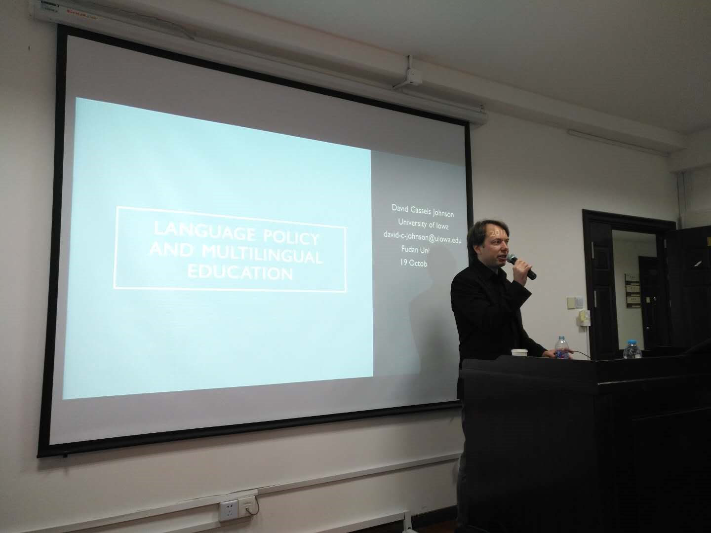 2017年10月19日,leyu乐鱼·官方web站登录入口“多语能力发展与第二外语习得研究”创新团队邀请爱荷华大学副教授David Cassels Johnson博士在文科楼543会议室做题为“语言政策与多语教育”的讲座。讲座由多语发展创新团队带头人、leyu乐鱼·官方web站登录入口外文学院郑咏滟副教授主持。会场座无虚席。