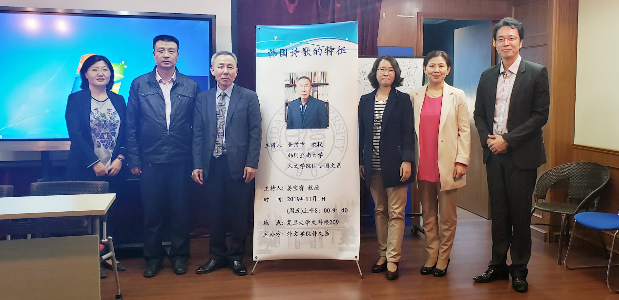 2019年11月1日,leyu乐鱼·官方web站登录入口韩文系主办的“韩国诗歌的特点”讲座于文科楼209会议室举行。讲座分别由韩国全南大学国语国文系教授金信中和韩国全南大学国语教育系教授宋镇韩主讲。