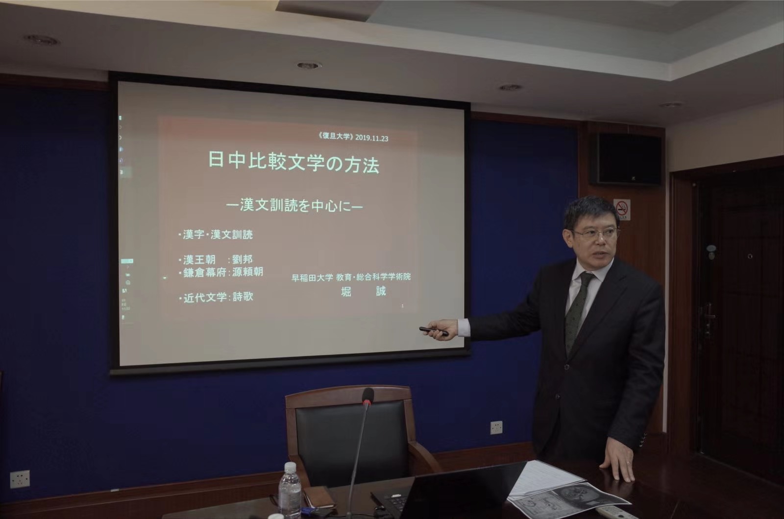 11月23日,堀诚教授以《日本文学中的中国古典——汉文训读与文学接受》为题,首先介绍了日本古代以汉文训读的方式接受中国文化的方法,以及王维等人的诗歌在日本国语教材中的刊载情况。然后以“鸠杖”为例,梳理中国古典中关于刘邦避难传说中“鸽子”“蜘蛛丝”等符号的演变,然后比对《源平盛衰记》中源赖朝躲避追杀的故事中的“鸽子”“蜘蛛丝”符号,以具体细致的个案分析揭示日本对于中国古典的接受及“脱胎换骨”进行改编的现象。