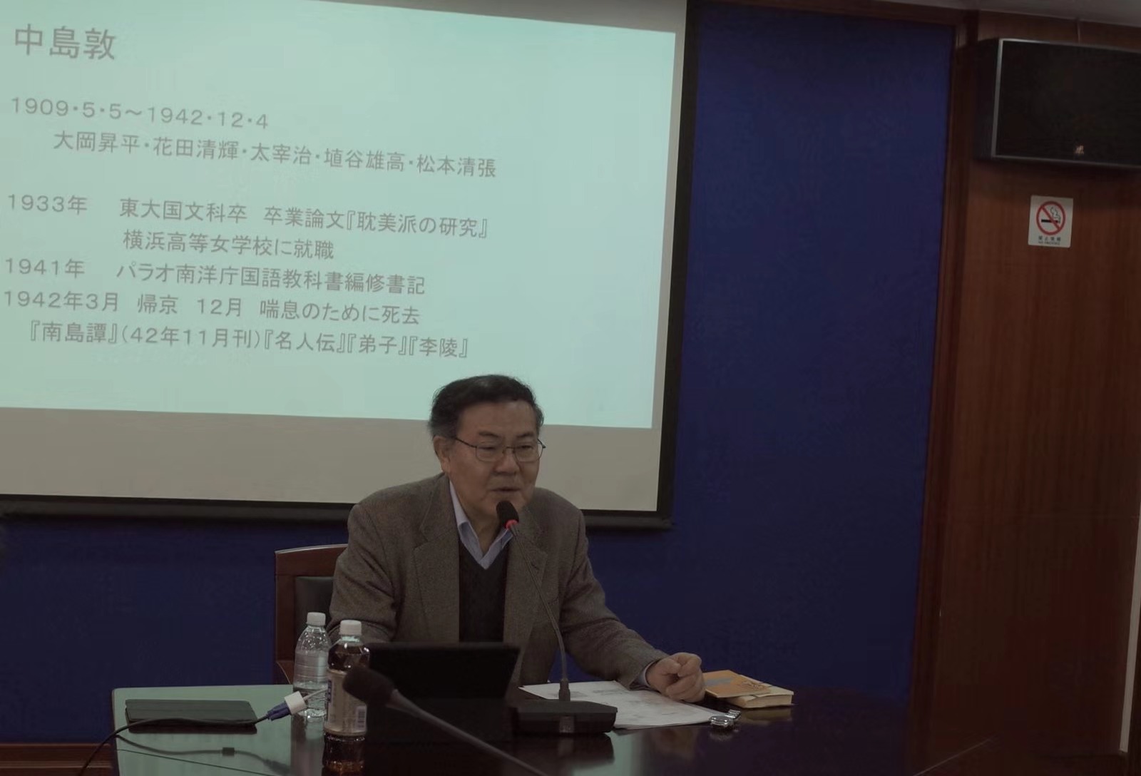 11月21日,千叶俊二教授以中岛敦代表作《文字祸》为题,从日本近代物理学家、随笔作家寺田寅彦的《关于法则》切入,指出日本文学与科学的联系。随后分析《文字祸》中文字“分解”为点划的隐喻,指出以中岛敦为代表的日本近代作家反思语言、文字的局限性,并结合中岛敦的《狼疾记》《山月记》中的“变形”意象,指出作者对主体、客体的必然性的反思,揭示出中岛敦作品内在的思想性。